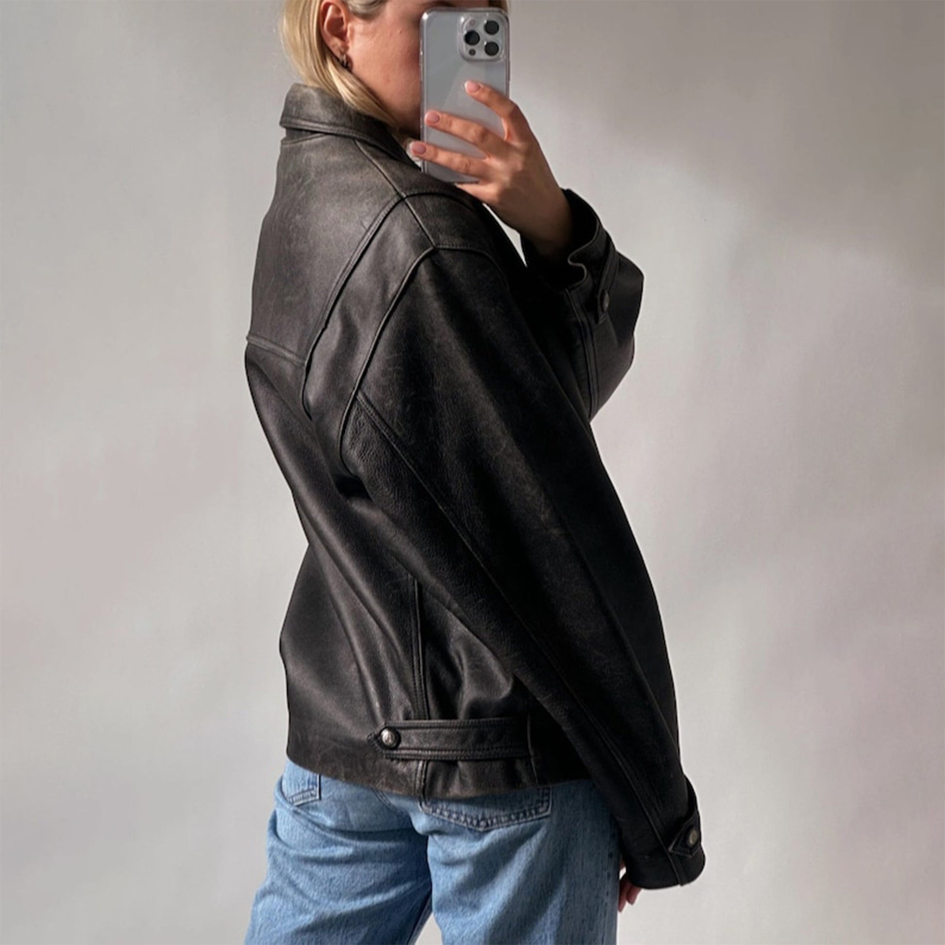 Women Vintage Black Real Sheepskin Oversized Leather Moto Jacket